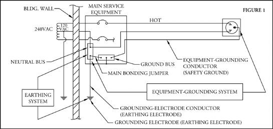 In the context of electrical systems, the word ground normally causes people to think of a connection to a water pipe or a ground rod. The National Electrical Code defines ground as a conducting connection, whether intentional or accidental between an electrical circuit or equipment and earth or some conducting body that serves in place of the earth. Grounded is defined as “Connected to earth or to some conducting body that serves in place of the earth”. Note that the phrase “or some conducting body that serves in place of the earth” appears in the definitions for ground and grounded. This means a ground can be established without a connection to earth as long as connection is made to “some conducting body that serves in place of the earth”. To clearly understand the purpose of grounding electrical systems and equipment, the subject of grounding must be divided into two categories: earth grounding and equipment grounding. People often confuse these two. Such confusion can result in misapplication of earth- and equipment-grounding practices and lead to a system that is expensive, inefficient, and even unsafe. The various components of equipment- and earth-grounding systems appear in Figure 1 below.