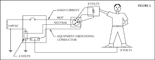 Figure 2 below illustrates a typical 120VAC circuit operating under normal conditions. The earth-electrode system establishes a zero-voltage reference at the main panel while the equipment-grounding system extends this zero-voltage reference from the main panel to the equipment’s metallic enclosure (cabinet).