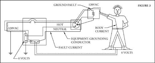 Figure 3 below illustrates the same 120VAC circuit under a ground fault condition. When a ground fault occurs, the equipment-grounding conductor becomes the return path for fault current to flow back to the source. The equipment enclosure will have a shock voltage resulting in a current flow through the operator’s body until the circuit breaker trips and opens the circuit. Therefore, a low impedance path is essential so that sufficient fault current occurs to cause the instantaneous operation of the circuit breaker.