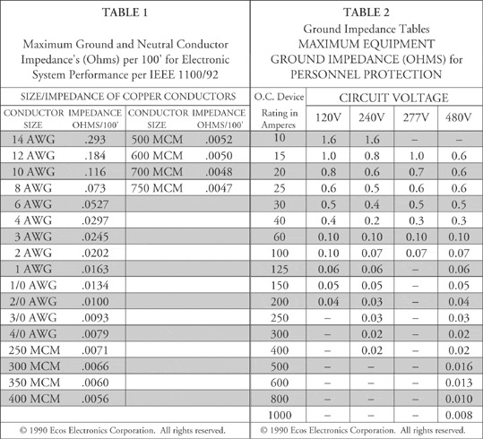 Tables 1 and 2 show maximum allowable impedances for grounding or neutral conductors. Values shown are within the requirements of the NEC, Canadian Electric Code, and IEEE standards. Using the proper testing instruments, always verify that the quality of the grounding or neutral conductors conforms to allowable impedance values. Where measurements show excessive impedance, take immediate steps to find and replace fault and tighten all connections. Some circumstances may require rerouting of conductors.