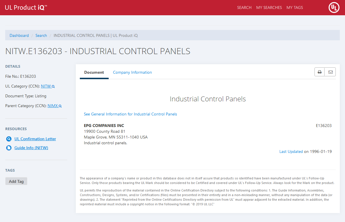 | EPG COMPANIES INC | Industrial Control Panels | NITW.E136203 |