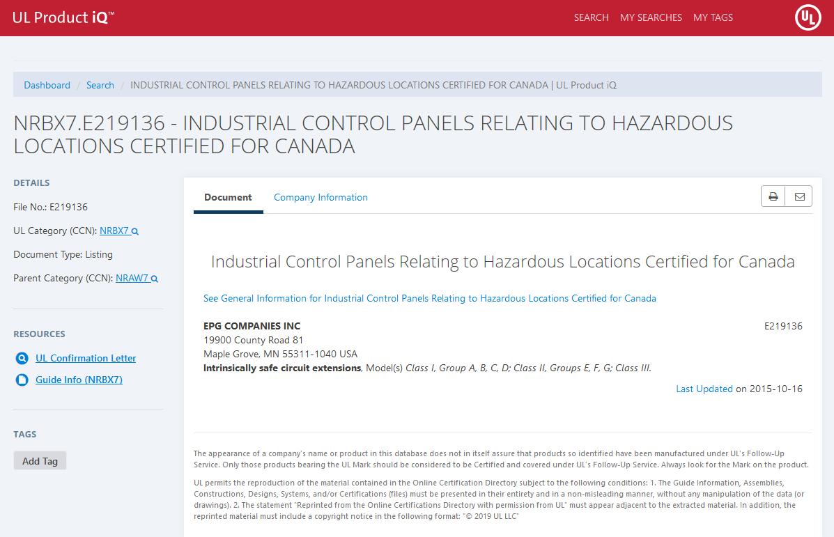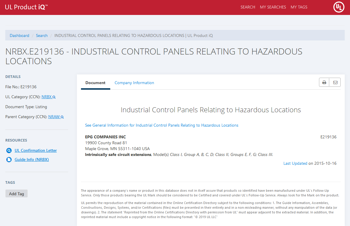 | EPG COMPANIES INC | Industrial Control Panels Relating to Hazardous Locations | NRBX.E219136 |