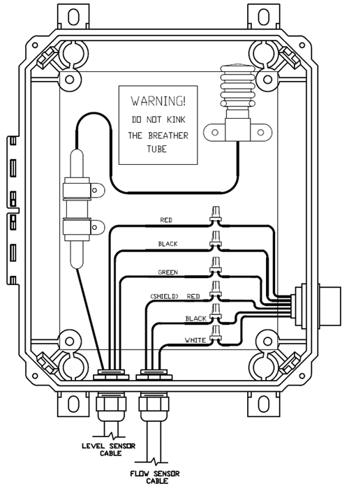 EPG Breakout Box, NEMA 4X non-metallic enclosure for 1 ea. level sensor and 1 ea. flow sensor or mag meter. Includes desiccant dryer, bellows, and SureSeal connectors.