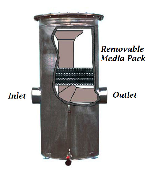 Since 1988, EPG Companies Inc. has built hundreds of its CS series condensate coalescer separator filter silencers for removal of both particulates and liquid droplets from air streams. Its unique up-flow design passes the air stream through a mixed media element which coalesces fine liquid vapor into larger droplets which, by gravity, drop to the bottom of the sump. Those droplets which are too small to overcome the velocity of the air stream are trapped in the separator layers of the media until they become large enough to drop out of the air stream at an efficiency of 99%. As the liquid droplets fall back down through the media pack, they tend to wash particulate matter out of the five (5) micron filter media carrying the particulates down to the sump.